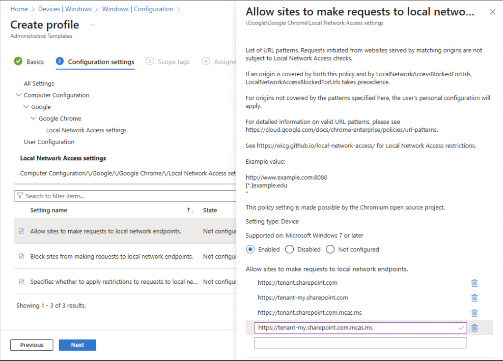 - Add the same SharePoint and OneDrive URLs to the Chrome policy as defined for Edge.