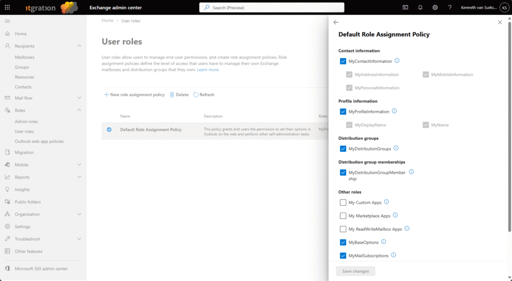 Path: Exchange admin center → Roles → User roles → Default Role Assignment Policy