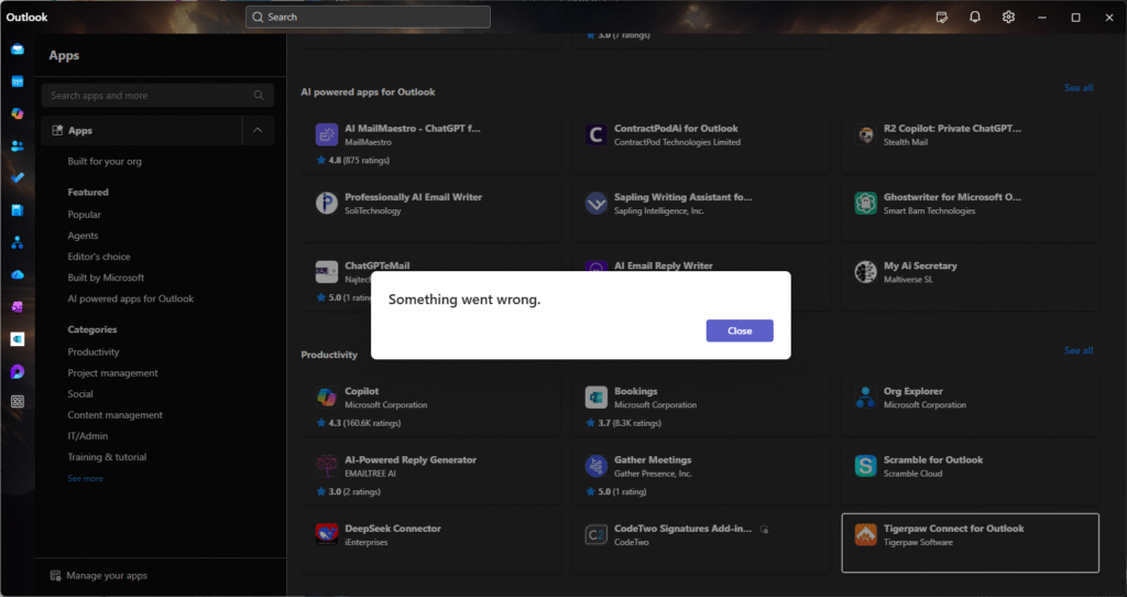 Once Configured the end-user experience is not that good though, because users can still browse the app store from the New Outlook client, but once they want to install the App, they get an error “Something went wrong” giving users no clue on what they should do next.