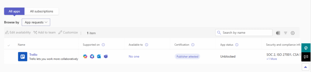 Path: Microsoft 365 admin center → Settings → Integrated Apps -> Available apps -> gear icon ->