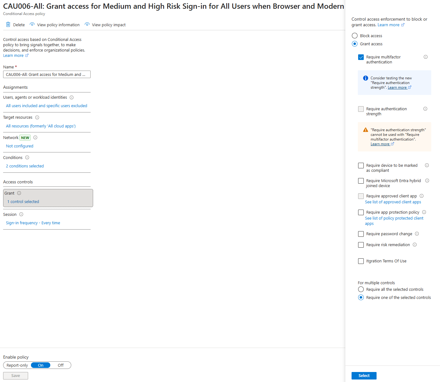 - Requiring authentication strength ensures that both password based and passwordless users are properly covered by the remediation policy. This guarantees consistent enforcement across authentication models.